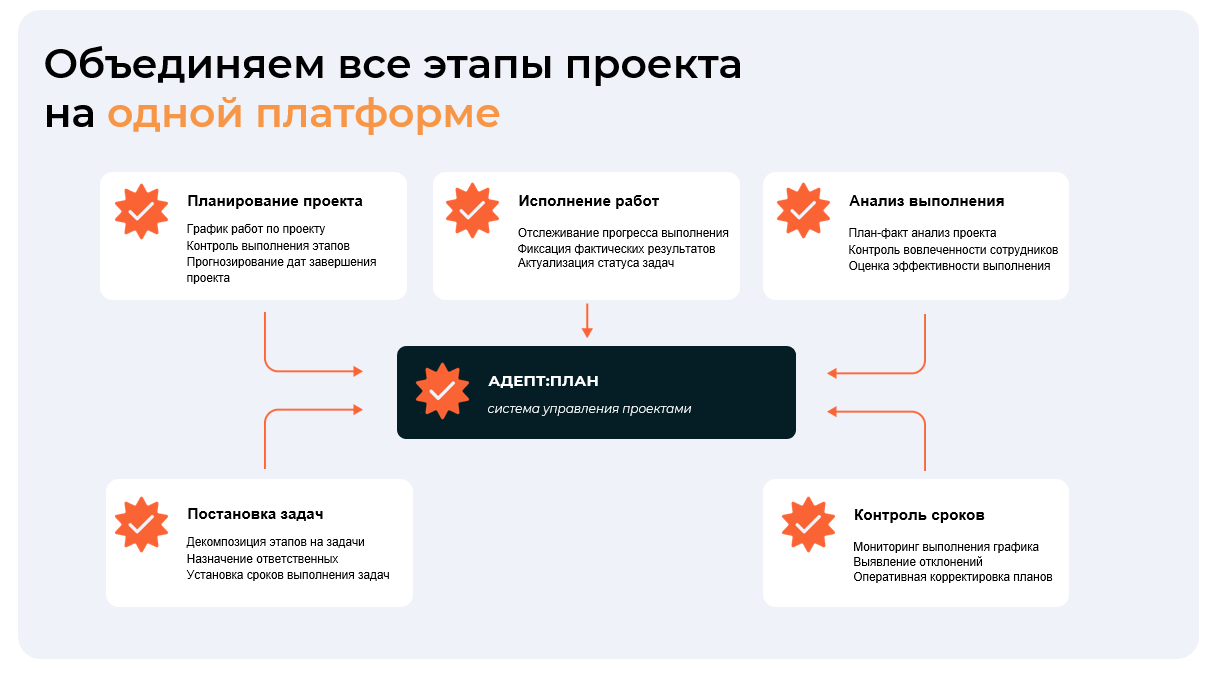 Как это работает: Весь процесс — как на ладони. Вы создаёте проект, загружаете документы (система сама их структурирует), разбиваете работы на этапы и задачи за пару кликов, назначаете исполнителей — они сразу получают уведомления. Автоматические отчёты, диаграммы Ганта и Kanban-доски показывают, что идёт по плану, а где нужны корректировки. «Адепт:План» не требует длительного внедрения — система готова к работе сразу.