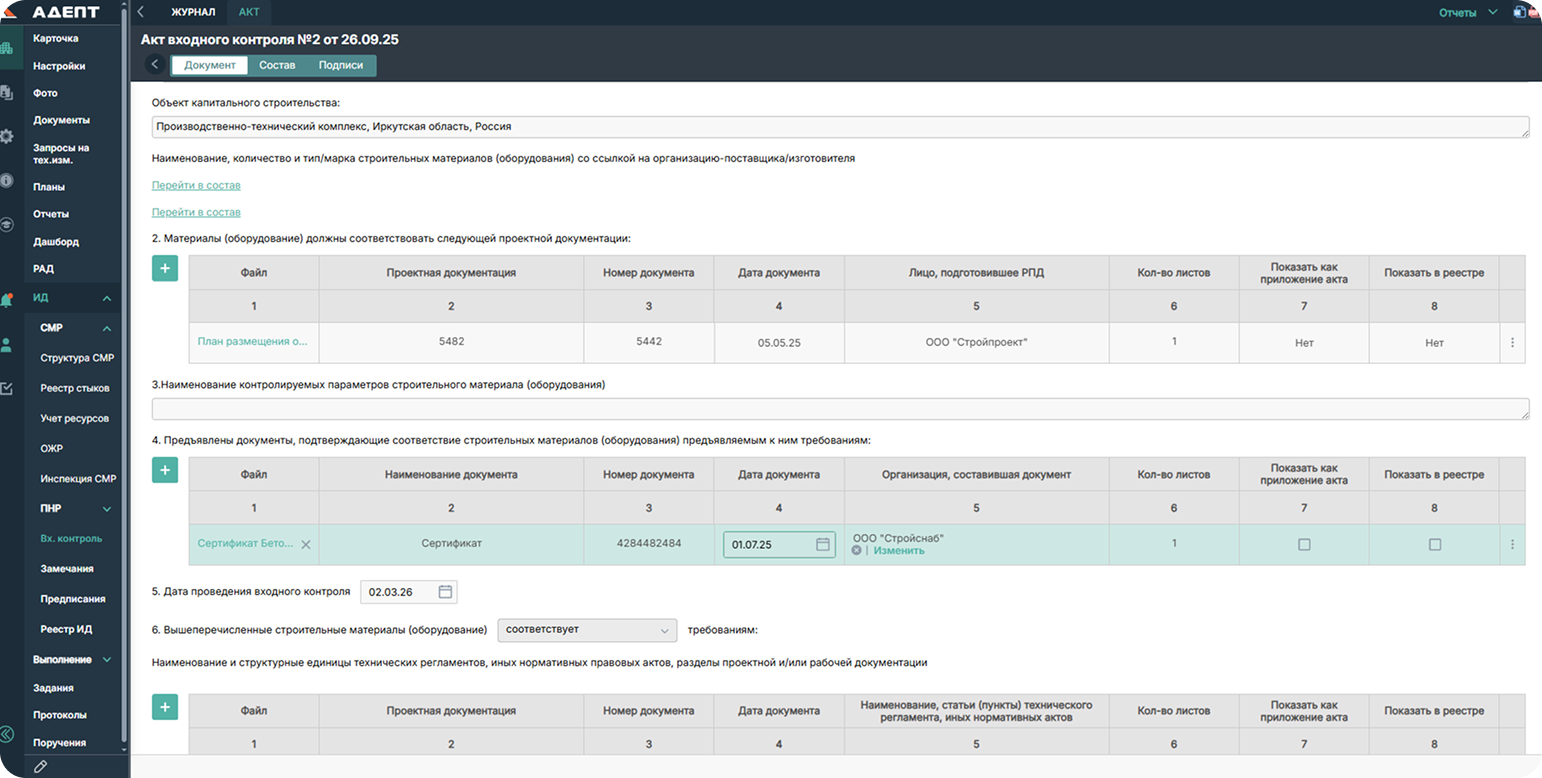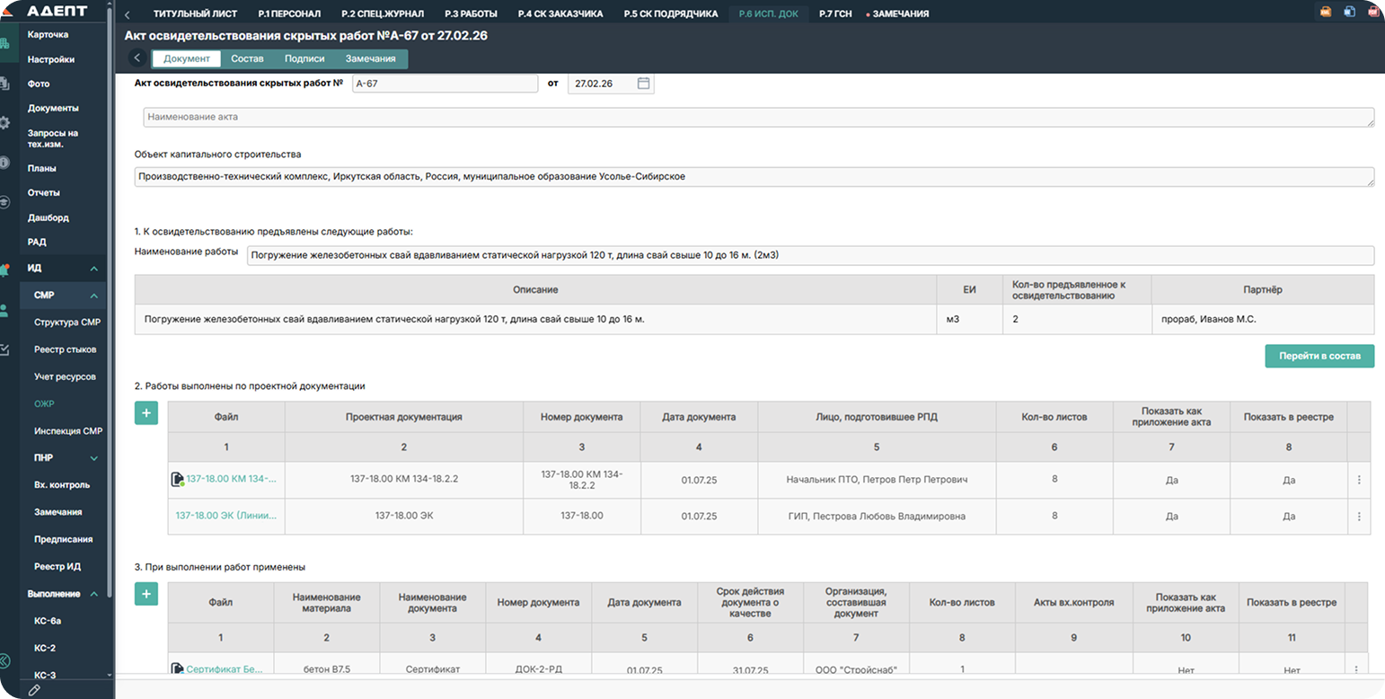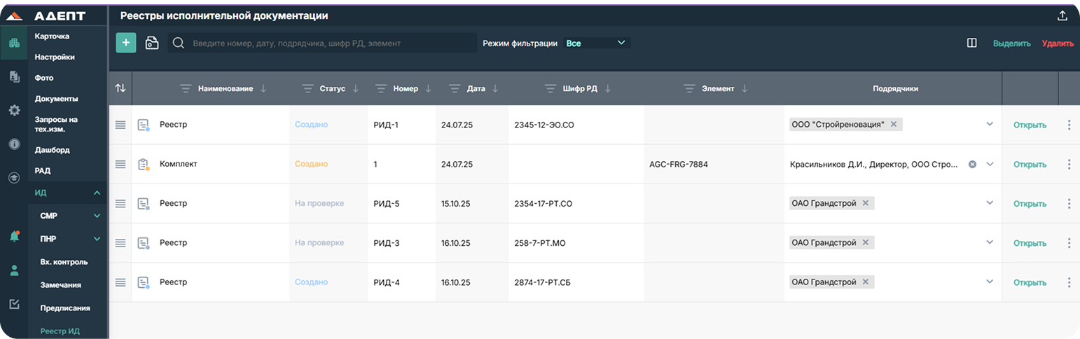 Подготовка и согласование исполнительной документации проходит в электронном виде. Реестр исполнительной документации формируется автоматически