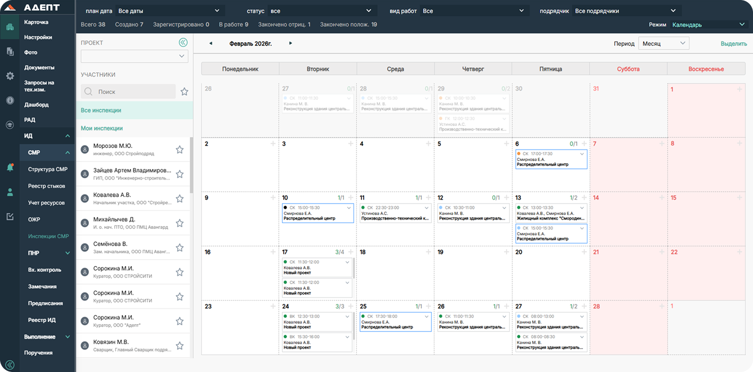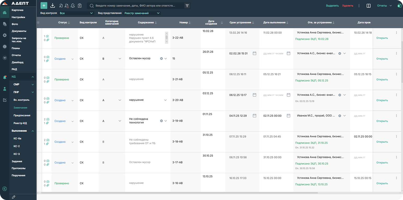 Специалисты строительного контроля планируют и согласуют проведение инспекций с Подрядчиками и Заказчиком, формируют замечания/предписания и контролируют устранение нарушений