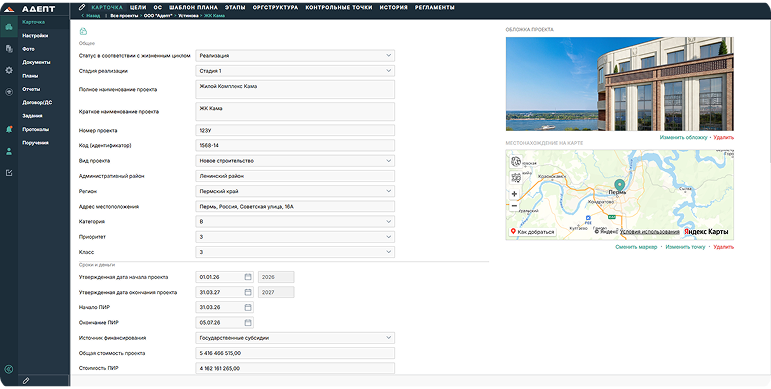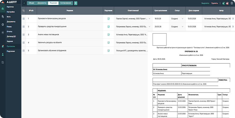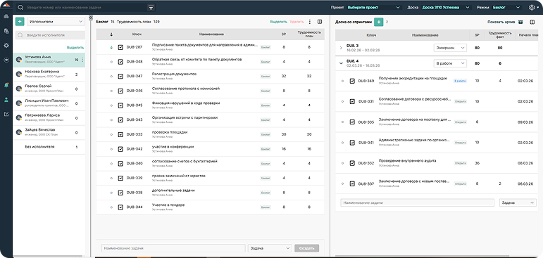 В системе акцент сделан не на задачах, а на управлении проектом: документах, решениях, поручениях и контроле исполнения. Это система управления проектами и командой, а не просто канбан‑доска.