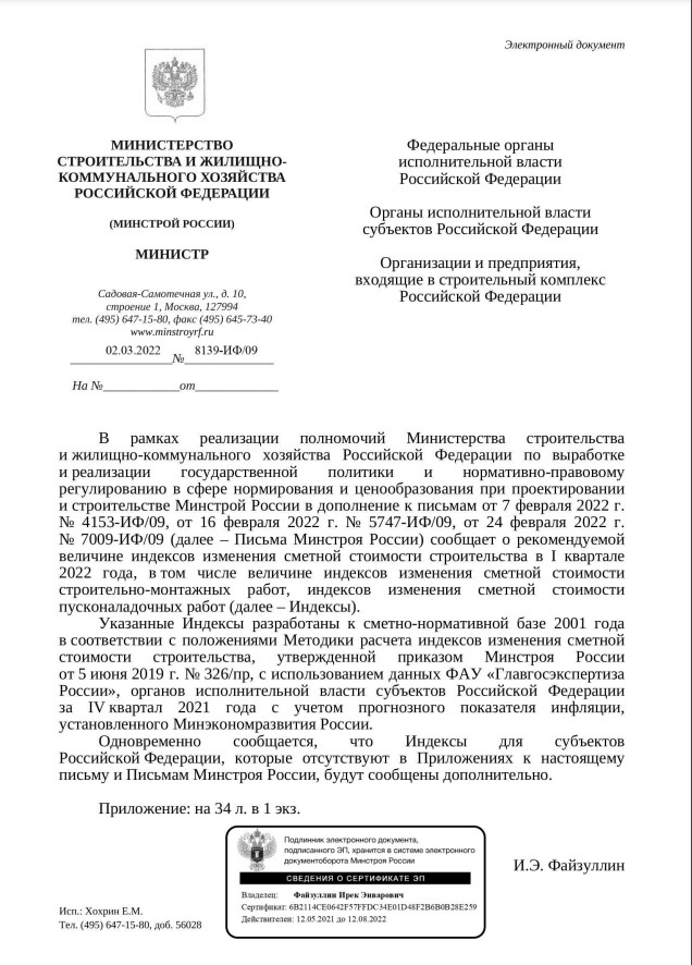 Письмо Минстроя России от 02 марта 2022 г. № 8139-ИФ/09 «О рекомендуемой величине прогнозных индексов изменения сметной стоимости строительства в Ⅰ квартале 2022 года, в том числе величине прогнозных индексов изменения сметной стоимости строительно-монтажных работ, стоимости пусконаладочных работ.»
