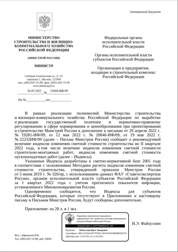 Письмо Минстроя России от 26 мая 2022 г. № 23868-ИФ/09 «О рекомендуемой величине прогнозных индексов изменения сметной стоимости строительства в ⅠⅠ квартале 2022 года, в том числе величине прогнозных индексов изменения сметной стоимости строительно-монтажных работ, стоимости пусконаладочных работ.»
