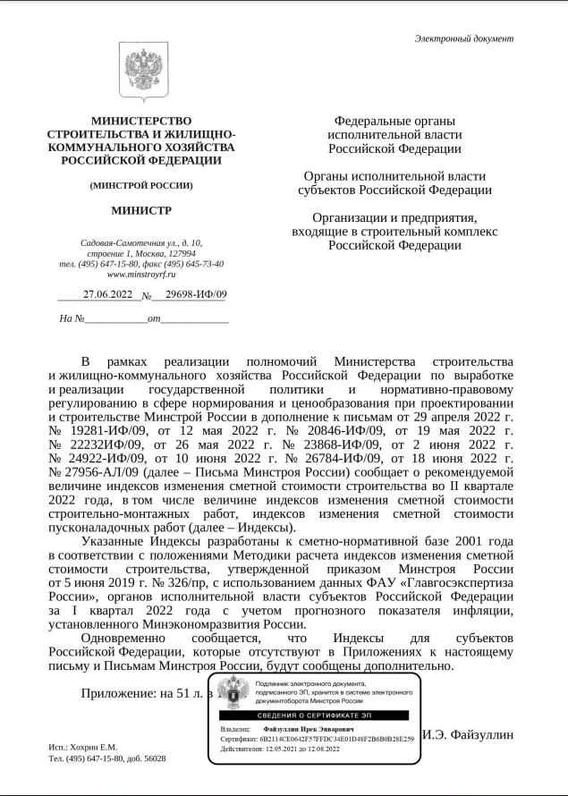 Письмо Минстроя России от 27 июня 2022 г. № 29698-ИФ/09 «О рекомендуемой величине прогнозных индексов изменения сметной стоимости строительства в ⅠⅠ квартале 2022 года, в том числе величине прогнозных индексов изменения сметной стоимости строительно-монтажных работ, стоимости пусконаладочных работ.»