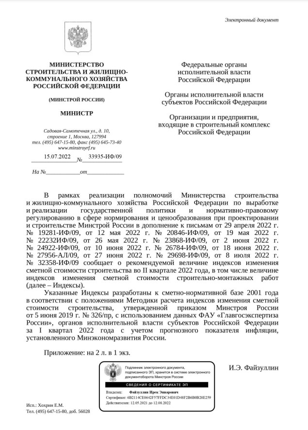 Письмо Минстроя России от 15 июля 2022 г. № 33935-ИФ/09 «О рекомендуемой величине прогнозных индексов изменения сметной стоимости строительства в ⅠⅠ квартале 2022 года, в том числе величине прогнозных индексов изменения сметной стоимости строительно-монтажных работ, стоимости пусконаладочных работ.»