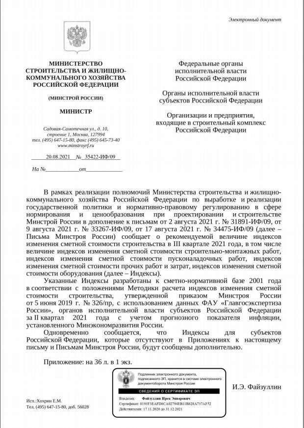 Письмо Минстроя России от 20 августа 2021 г. № 35422-ИФ/09 «О рекомендуемой величине прогнозных индексов изменения сметной стоимости строительства в III квартале 2021 года, в том числе величине прогнозных индексов изменения сметной стоимости строительно-монтажных работ, стоимости пусконаладочных работ.»