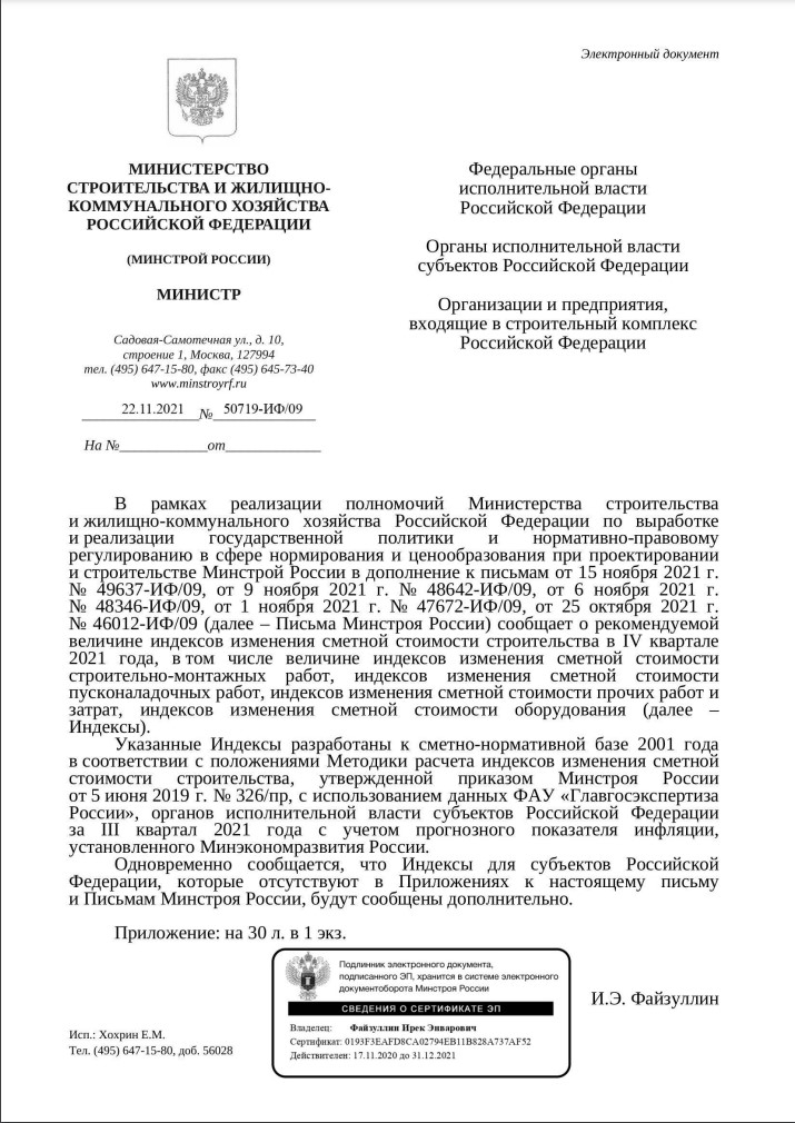 Письмо Минстроя России от 22 ноября 2021 г. № 50719-ИФ/09 «О рекомендуемой величине прогнозных индексов изменения сметной стоимости строительства в Ⅳ квартале 2021 года, в том числе величине прогнозных индексов изменения сметной стоимости строительно-монтажных работ, стоимости пусконаладочных работ.»